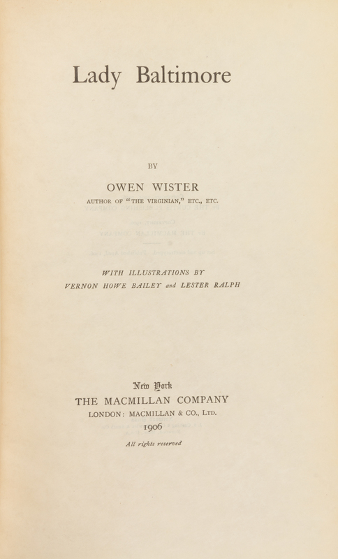 WISTER, Owen (1860-1938). Lady Baltimore. New York: MacMillan & Co., 1906.