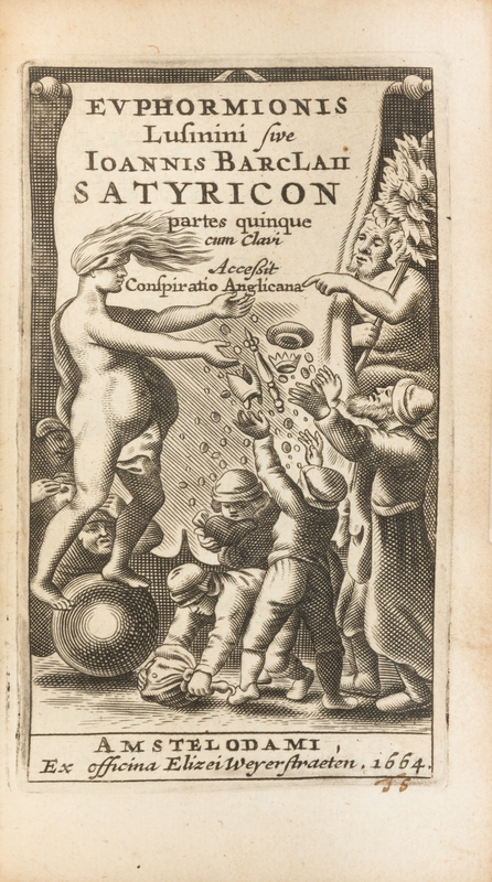 BARCLAY, John. [Argenis.] N.p.: n.p., n.d.; -Euphormionis Lusinini, Sive...Satyricon. Amsterdam: Elizei Weyerstraeten [Elzevir], 1664. -Icon Animorum.Frankfurt & Marborg: Christian Hermsdorf, 1668.