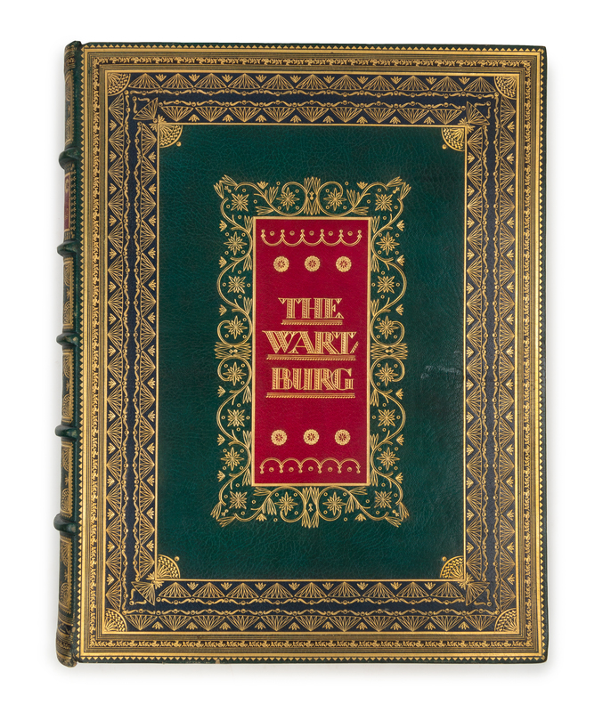 Folio (497 x 376 mm). Numerious illlustrated plates, numerous in-text illustrations. Green morocco gilt, black and blue morocco onlay borders gilt surrounding central red morocco onlay gilt-lettered, spine in 6 compartments with 5 raised bands, red morocco lettering-piece gilt, the rest gilt decorated, board edges and turn-ins gilt, blue morocco doublures and endpapers gilt, edges gilt and gauffered. LIMITED EDITION, number 74 of 350 copies about the famous castle in the Thuringian Forest near Eisenach, Germany.