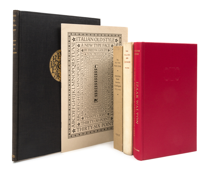 GOUDY, Frederic W. The Alphabet. Fifteen Interpretive Designs Drawn and Arranged with Explanatory Text and Illustrations. New York: Michael Kennerley, 1922. 4to. Frontispiece printed in red and black, numerous illustrations. Publisher's cloth; original cardboard slipcase (broken). Second edition. Provenance: Carl W. Jones (bookplate). -- GOUDY, Frederic W. Italian Old Style. A New Type Designed by Frederic W. Goudy and produced by the Lanston Monotype Machine Company of Philadelphia. Mount Vernon, NY: Rudge, 1924. Numerous illustrations. Original wrappers; original mailing envelope. Provenance: Carl W. Jones (envelope). -- WAGNER, Henry R. The Plains and the Rockies. A Bibliography of Original Narratives of Travel and Adventure. San Francisco: John Howell, 1921. 8vo. Numerous title-page facsimiles tipped in. Original cloth-backed boards; brown cloth jacket. -- COIGNEY, Rodolphe L. Izaak Walton A New Bibliography 1653-1987. New York: James Cummins, 1989. 8vo. Original cloth; original dust-jacket. -- MCKAY, George L. and Clarence S. BRIGHAM. American Book Auction Catalogues. New York: The New York Public Library, 1937. 8vo. Original wrappers. -- Together, 5 items, condition generally fine.