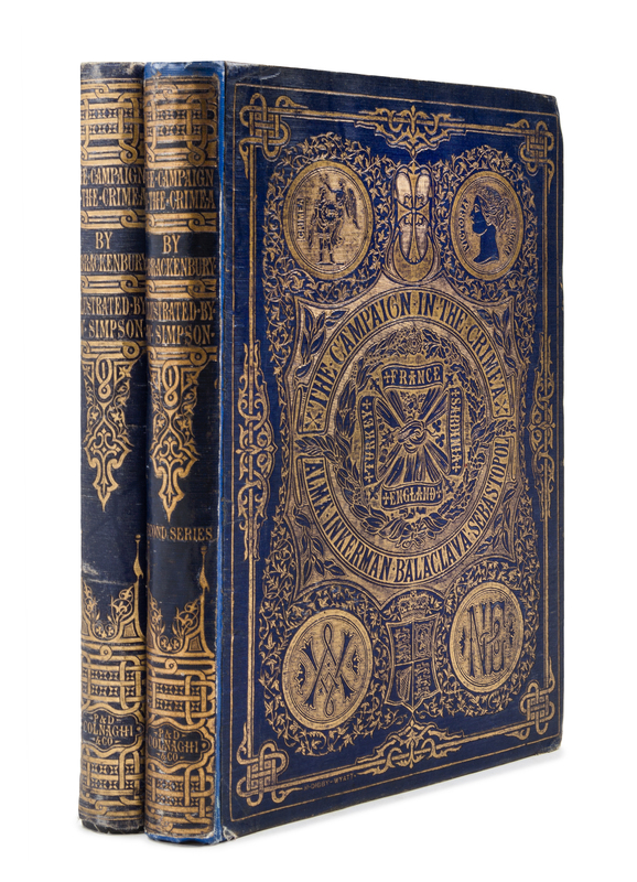 2 volumes, large 8vo (248 x 167 mm). Lithographic title-pages, numerous tinted plates from drawings taken on the spot by William Simpson. (Scant spotting, text leaves creased.) Publisher's blue gold-stamped cloth, edges gilt (corners bumped, slight chipping to ends of spines). FIRST OCTAVO EDITION. A reduced version of Simpson's Seat of the War in the East.