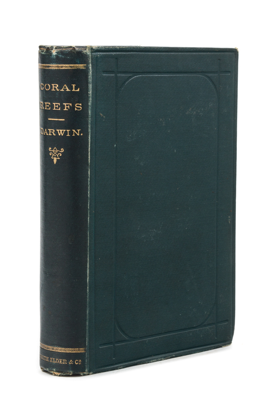 On the Origin of Species by Meand of Natural Selection. London: John Murray, 1873. 8vo (182 x 117 mm). Folding table. Later half calf, spine gilt, edges marbled. Sixth edition. -- Different Forms of Flowers. London: John Murray, 1884. 8vo (188 x 125 mm). (Short tear to upper margin of title.) Publisher's green cloth, spine gold-stamped, edges uncut. Third thousand. -- The Structure and Distribution of Coral Reefs. London: Smith, Elder, & Co., 1889. 8vo (190 x 128 mm). Half-title, folding maps printed in color (a few short tears). Publisher's green cloth, spine gold-stamped, edges uncut (some light wear to extremities). Third edition. Provenance: H.M.S. Stationery Office (stamp on half-title); A. Ralph Thompson (typed label on pastedown). -- Together, 3 volumes.