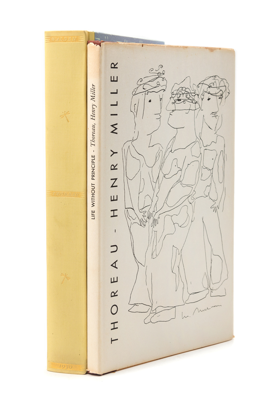 Walden or Life in the Woods. Rudolph Ruzicka, illustrator. Chicago: Lakeside Press, 1930. 8vo. Numerous illustrations. Original cloth-backed decorated boards; original slipcase (lightly stained). LIMITED EDITION, one of 1000 unnumbered copies. [With:] Life Without Principle: Three Essays. Stanford: James Ladd Delkin, 1946. 8vo. Orange device on title-page. Original cloth-backed decorated boards; printed dust jacket featuring drawings by Lee Mullican (some very light wear with minor losses to corners and spine ends); original glassine (some minor chipping with associated losses).