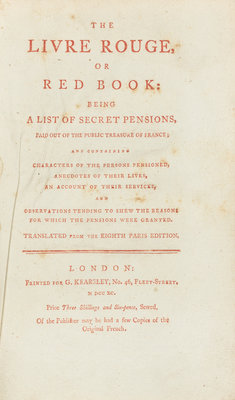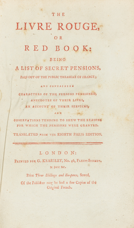 [FRENCH REVOLUTION]. La Reynie de La Bruyre, Jean-Baptiste-Marie-Louis (1760-1830?). The Livre Rouge, or Red Book: being a list of secret pensions paid out of the public treasure of France. London: for G. Kearsley, 1790.