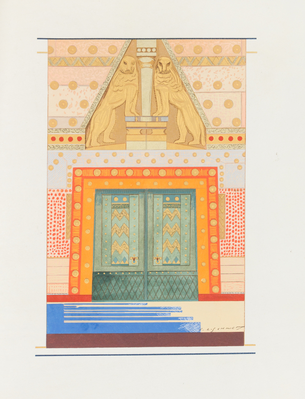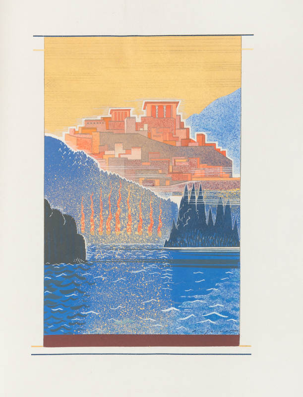 One volume (of 4), 4to (287 x 237 mm). 23 pochoir plates (17 full-page), numerous decorated initials and bar borders after Schmied and colored by Jean Saude, text printed in blue and black on Japan vellum. Loose as issued in limp vellum wrapper, gilt lettered, stiff vellum chemise, vellum slipcase (upper joint of wrapper splitting, some toning or staining). LIMITED EDITION, COLLABORATOR'S COPY, letter C of an unknown number (3?) of a total edition of 145 with manuscript note: "Les bibliophiles de l'Automobile Club de France." THO SCHMID'S COPY. Tho Schmied (1900-1985) was a gifted illustrator who cut many of the woodcuts for this work. A FINE ASSOCIATION COPY.