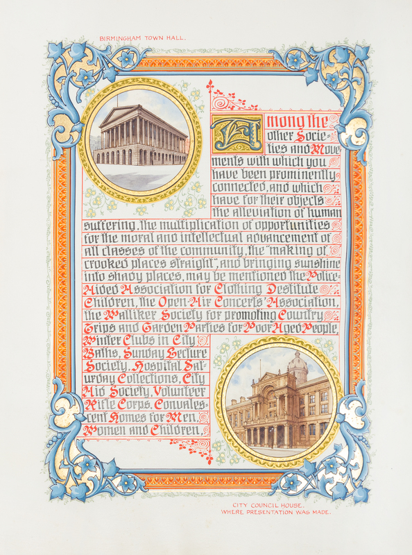 Small folio (343 x 263 mm). 5 illuminated leaves on vellum by Newey, decorative borders and miniatures in gouache heightened in gold, 7 manuscript leaves listing names, text within deocrated gold and green, orange, blue, or yellow borders. Numerous photographs mounted to leaves throughout. Original red morocco gilt by Morton & Newey; original box. ILLUMINATED ADDRESS, presented to D. J. O'Neill by the town of Birmingham in gratitude for his public service. O'Neill, who is best known for his role in preserving Aston Hall in Birmingham, was remembered in his 1914 Birmingham Gazette obituary as "The Friend of the Poor" and "one of the most interesting personalities in the public and social life of Birmingham for upwards of half a century." Tipped in are photographs and signatures including a photograph SIGNED BY PRINCESS ALEXANDRA accompanied by a letter from her secretary. [Laid in:] various manuscripts and ephemera relating to O'Neill and Birmingham.