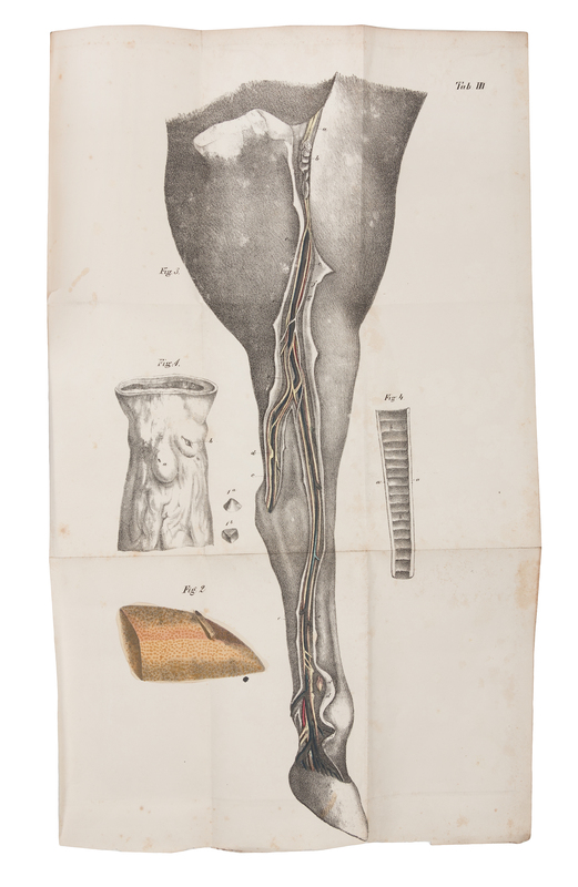 Veroffentlichungen aus dem Gebiete des Militar-Sanitatswesens. Herausgegeben von der Medicinal-Abtheilung des Koniglich Preussischen Kriegsministeriums. Berlin: August Hirschwald, 1896. Original printed wrappers (some plates have been extracted from the text leaves). -- BARDELEBEN, Adolf. Lehrbuch der Chiurgie und Operationslehre, mit freier Benutzung von Vidal's Traite de pathologie externe et de medecine operatoire... Berlin: Georg Reimer, 1860. -- Contemporary marbled boards. -- GURLT, E.F. Lehrbuch der Pathologischen Anatomie der Haus-Saugethiere. Berlin: G. Reimer, 1831. Contemporary green cloth. -- Together 3 volumes, 8vo, condition generally good.