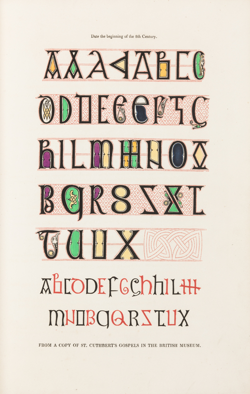 AUDSLEY, W. & G. Polychromatic Decoration as Applied to Buildings in the Medieval Styles. London: Henry Sotheran & Co., 1882. Folio. Half-title, numerous plates. Publisher's red cloth gilt (joints rubbed, chipping to head and foot of spine, scant staining). -- SHAW, Henry. Alphabets, Numerals and Devices of the Middle Ages. London: William Pickering, 1845. 4to. Half-title, title printed in red and black; 48 chromolithographic or lithographic plates. Contemporary brown half morocco, spine gilt, top edge gilt, others uncut. FIRST EDITION. -- Dresses and Decorations of the Middle Ages. London: William Pickering, 1843. 2 volumes, 4to. 94 color-printed plates, some finished by hand. Original olive morocco gilt. FIRST EDITION. -- TYMMS, W.R. and M.D. WYATT. The Art of Illuminating as Practised in Europe from the Earliest Times. London: Day and Son, Limited, [ca 1866]. 8vo. Chromolithographic title, 95 chromolithographic plates. Publisher's embossed brown cloth. FIRST EDITION. -- Together 4 works in 5 volumes, condition generally good.