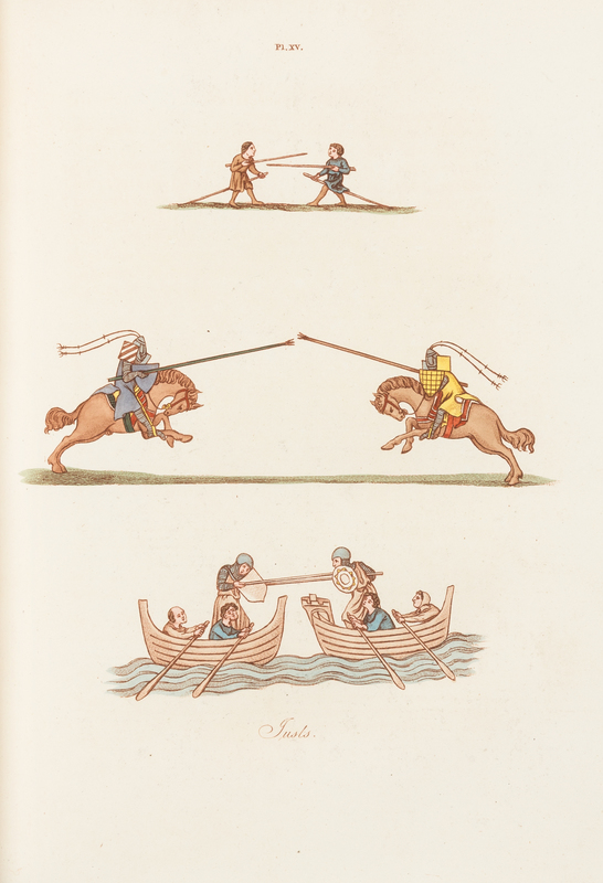 4to (291 x 228 mm). 40 hand-colored engraved plates. (Spotting and offsetting throughout, minor tears or losses to text leaves, not affecting text.) Contemporary half brown morocco, spine in 6 compartments with 5 raised bands, gilt, edges gilt (rubbing to extremities). Second edition which includes an insight into the rural and domestic recreations, may-games, mummeries, pageants, processions and pompous spectacles from the earliest period until the 18th- and 19th-centuries.