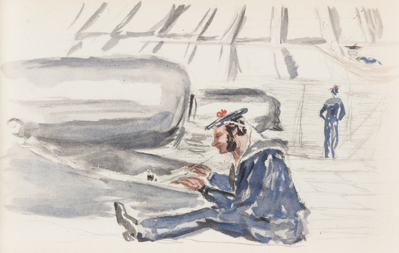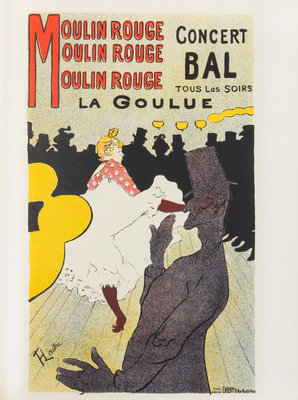 JULIEN, Edouard, editor. Les Affiches de Toulouse-Lautrec. Monte Carlo: Andr Sauret, [1950]. Folio. 38 chromolithographic plates, including 6 plates illustrating 4-color chromolithographic printing process of "Moulin Rouge." Publisher's printed wrappers (some very light wear to extremities); original glassine (a few tiny chips, small portion lacking upper cover). [With:]TOULOUSE-LAUTREC, Henri de. Album de marine. [Paris: Berggruen & Cie, 1952]. One volume (of 2) only (lacking text by M.G. D'Ortu). Oblong 8vo. Facsimile sketch book. Publisher's decorated cloth; original slip-case (upper hinges starting).