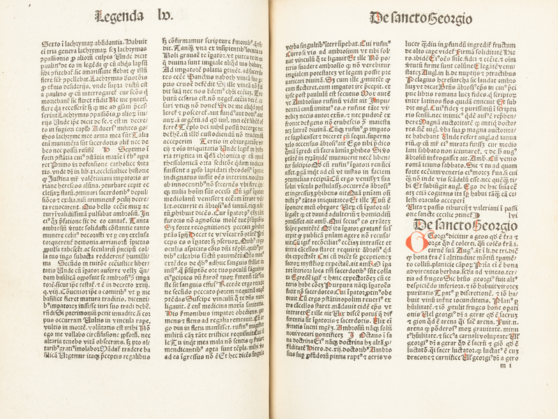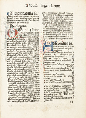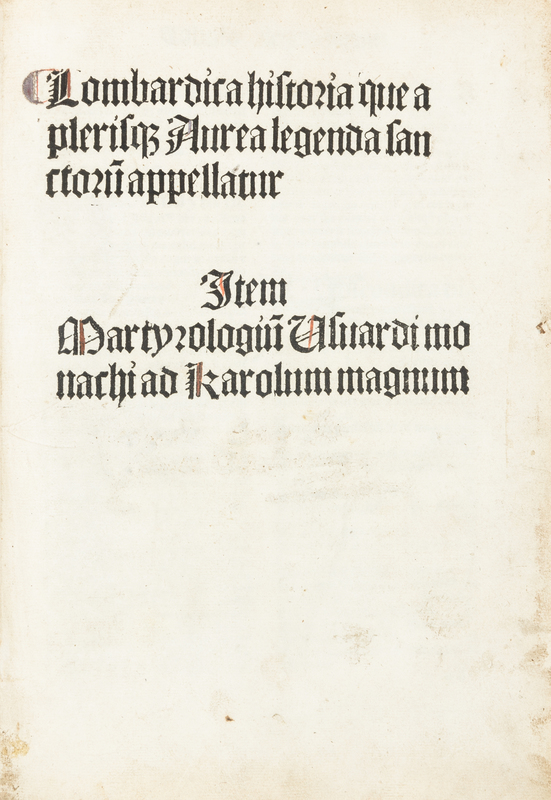 Chancery folio (268 x 197 mm). Collation: a8 b6 c-e8 f6 g-h8 i6 i8 k-l6 m-z A-F8.6 G6 H-N8.6 2a-2h6.8 (a1r title, a1v blank, a2r table, c1r Legenda aurea, N1v explicit, N2r additional texts, 2a1r title, 2a1v blank, 2a2r Martyrologium, h8r colophon, h8v blank). 316 leaves. 45 lines and headline, double column. Type: 18:290G, 15:175bG, 17:86G, 16:80G. Opening initials on a2 and c1 in red or blue with contrasting penwork decoration, other 2- to 4-line initials in red or blue, red capital strokes, some printed guide-letters. (Title with a few small repairs and inner margin renewed, last letter of the third-to-last line and last two lines of colophon erased, a few pale stains.) Late 19th-century blind-tooled tan pigskin, spine gilt, edges red, by W.H. Smith with his ticket (joints starting, with some amateurish repairs, some light wear).Koelhoff's edition of the popular collection of saints' lives, the Golden Legend, to which is appended for the first time the martyrologium of Usuardus. The colophon is dated 'in vigilia sanctissimorum trium Regum', interpreted by A. Labarre as 22 July, correcting previous interpretations of 5 January (cf. Gutenberg-Jahrbuch 1975, pp.77-80). C 6465 (Voragine only); HCR (Usardus only) 16111; BMC I, 229 (IB. 3615); CIBN J-96; Bod-inc J-060; Goff J-123.