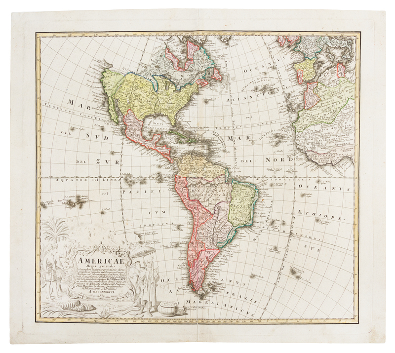 Americae Mappa generalis. [Nuremberg: Homann Heirs, 1746 or later].Hand-colored engraved map, image 457 x 520 mm (sheet 522 x 603 mm). Decorative cartouche. (Approximately 3-in. tear to fold repaired on verso, vertical center fold.) Map of the Americas extending to show the southwest Europe and the western part of Africa.