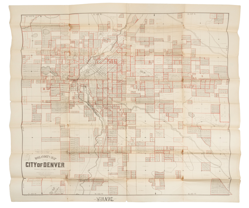 Lithographic folding map printed red outline image 838 x 829 mm (900 x 920 mm sheet). (A few tears or separations to folds.) First edition of this rare separately issued map of Denver, including the South Platte River, Cherry Creek, Sand Creek, and Sloan's Lake.