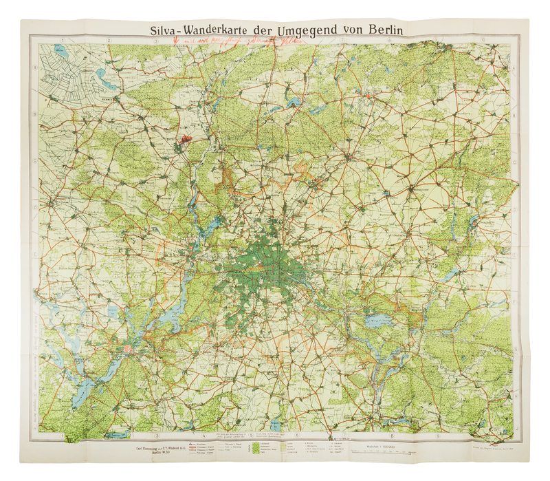 [BERLIN]. Sylva Um Gegend von Berlin. Berlin: Bogdan Gisevius, n.d. 708 x 810 mm sheet. Color-printed map of the forest around Berlin. Original printed card covers. -- GRUNDEMANN, R. Neuer Missions-Atlas aller evangelischens Missionsgebiete. Calw and Stuttgart: Verlag der Vereinsbuchhandlung, 1903. 4to. Numerous printed maps of the world. Original half brown morocco, green cloth. -- Meyer's Universum. New York: Paul Bernhard, 1856. Volume 7 only. Numerous plates. Original half leather (lacking upper cover). -- Together 3 volumes.