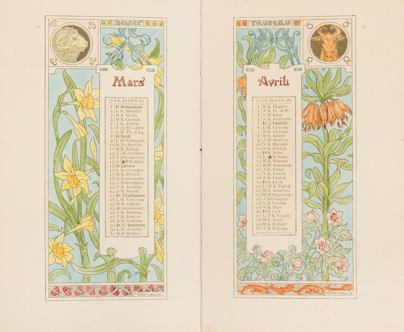 Small 8vo (180 x 108 mm). 12 hand-colored plates (one for each month) by Verneuil, 2 hand-colored plates for notes at end. (A few pale spots). Hand-colored printed wrappers, stab sewn, red silk tie (lightly spotted); laid into board covers, hand-colored printed labe on upper cover (scant spotting, a single silk tie remaining). Art Nouveau artist Verneuil, a student of Grasset, was inspired by natural elements and Japanese art. He designed numerous posters, furniture, textiles and ceramics.