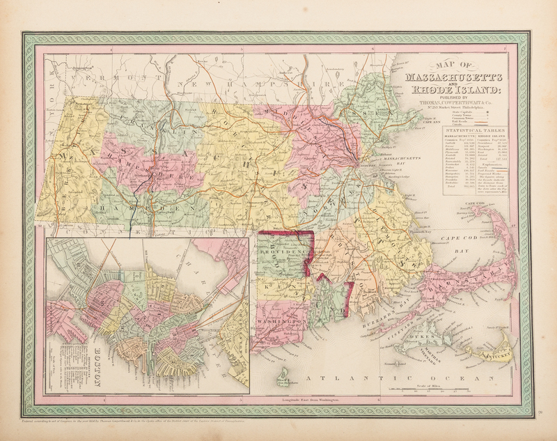 Folio (430 x 355 mm). Chromolithographic title, chromolithographic contents leaf, hand-colored lithographic frontispiece, 73 hand-colored lithographic maps. (Overall spotting and browning, minor marginaltears to leaves.) Original red half morocco gilt, green marbled boards, red morocco lettering-piece gilt to upper cover (upper cover detached, spine perished, worn). Cowperthwait purchased Mitchell's copyright in 1850, after which he began issuing Mitchell's atlas.