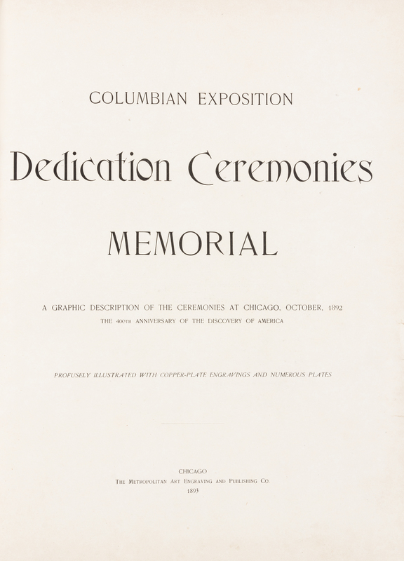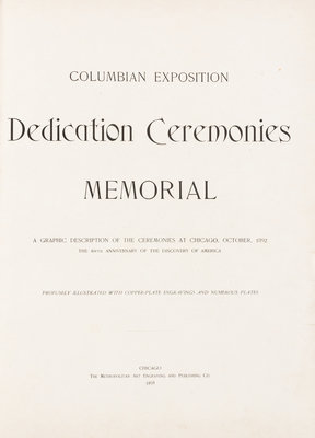 [1892 COLUMBIAN EXPOSITION]. Columbian Exposition: Dedication Ceremonies Memorial... Chicago: The Metropolitan Art Engraving and Publishing Co., 1893.