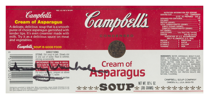 Campbell's Soup Can Label (Cream of Asparagus)Printed paper label, ca 1974 or later, signed in felt tip marker, matted framed and glazed.