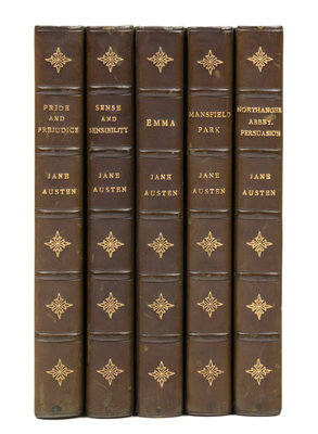 Pride and Prejudice. - Sense and Sensibility. - Northanger Abbey and Persuasion. - Mansfield Park. - Emma. - 5 volumes, 12 mo (174 x 109 mm). Illustrated colored frontispieces, half-titles. (Spotting throughout.) Original green limp leather gilt, slipcase, spines gilt, top edges gilt (minor rubbing to extremities, even fading to spines).