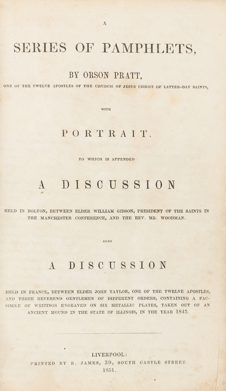 [MORMONISM]. PRATT, Orson (1811-1881). A Series of Pamphlets...with a Portrait. To which is appended a Discussion...between Elder William Gibson...and the Rev. Mr. Woodman. Also a Discussion...between Elder John Taylor...and Three Reverend Gentlemen. Liverpool: R. James, 1821.