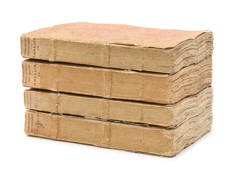 4 volumes, 8vo (224 x 135 mm). Half-titles. 4 engraved folding maps, engraved folding plate. ORIGINAL SPRINKLED WRAPPERS, printed spine labels, uncut (upper cover to vol.I detached, some light chipping, otherwise fine). FIRST DUTCH EDITION of Robertson's early history America, with maps depicting the Gulf of Mexico, Mexico and California, South America, and Panama. A fifth part (not present here) was published in 1801. Sabin 71999.