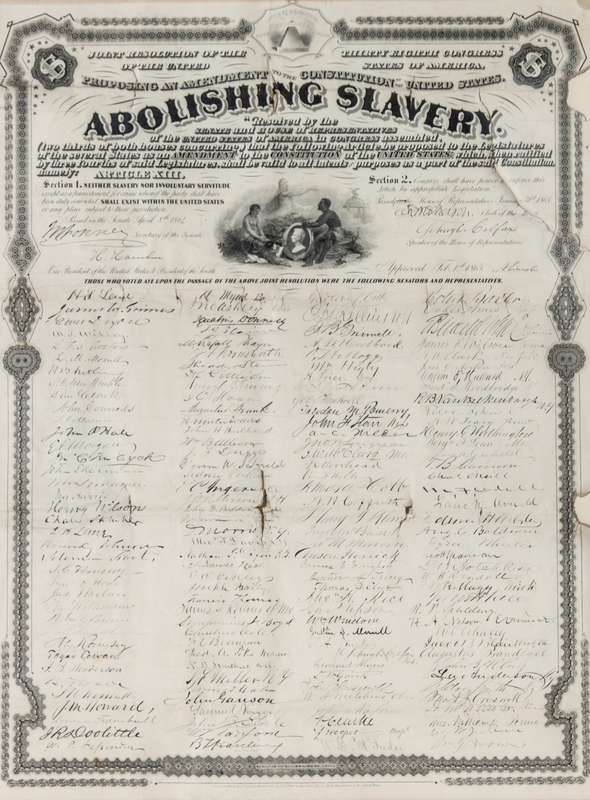 Large folio (538 x 414 mm). Finely engraved, elaborate decorative borders with "US" monogram to upper corners, bold calligraphic heading. With engraved signatures of President Lincoln, Vice President H. Hamlin, Speaker of the Senate Schuyler Colfax, and Secretary of the Senate, J.W. Forney, in addition to 164 Senators and Congressmen.A decorated and rare engraving based on the signed "souvenir" copies on parchment, a handful of which were signed by the President, the Senate and Members of Congress when the amendment was submitted for ratification in February 1865. This Reconstruction-era engraving, elaborately decorated by an important firm of engravers, contains no indication of the purpose for which it was intended. It was copyrighted by D.R. Clark in 1868.