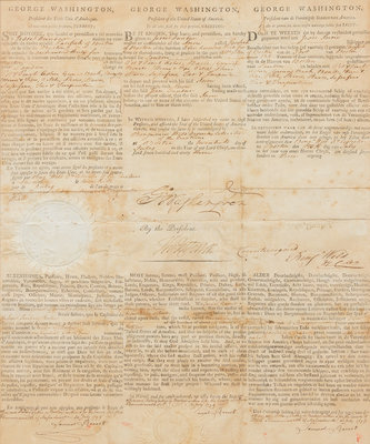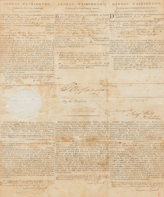 A THREE LANGUAGE SHIP'S PAPER WITH TEXT IN FRENCH, ENGLISH, AND DUTCH: "Be it known, That leave and permission are hereby given to Jesse Dunbar, master or commander of the Snow called Pacifick of Boston of the burthen of one hundred thirty five tons or thereabouts, lying at the present in the port of Boston and bound for London and laden with pot of pearl ashes, ground bark, boards, horns & tips, pitch, skins, staves, sassafras, tar & turpentine." (A few wormholes affecting printed letters and a portion of the "Was" in Washington's signature, the "a", and portions of the "W" and "s" in old facsimile, some browning). Such ship's papers were intended to protect merchants from molestation by the naval vessels involved in the Napoleonic wars, though they were largely ineffective. Examples signed by Washington and Jefferson are increasingly scarce.