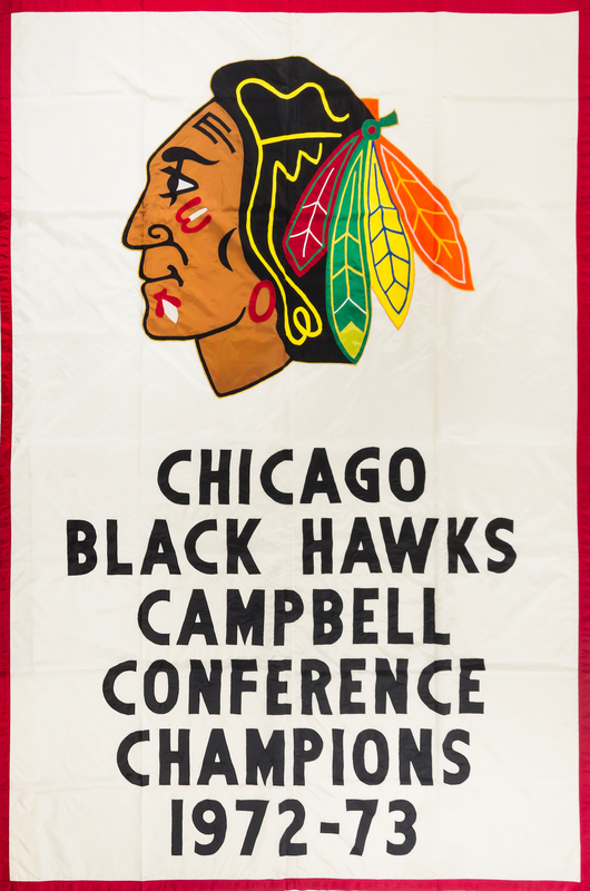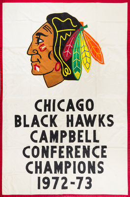 Oversized cloth stadium banner, team logo and lettering stitched to cream background with bold red border. Awarded after the 1972-1973 season to the Clarence S. Campbell Bowl-winning Chicago Black Hawks. The Clarence S. Campbell Bowl was awarded to the winners of the West Division. The Chicago Black Hawks defeated the New York Rangers in the series 4-1; it was the fifth playoff series for the two franchises, with Chicago winning three of the previous four postseason meetings. The team was led by Tony Esposito in the goal, Stan Mikita at Center, and Dennis Hull at Left Wing.