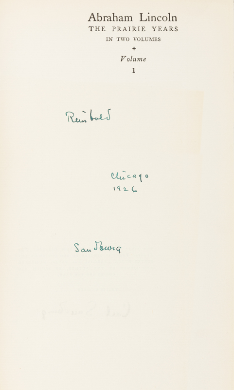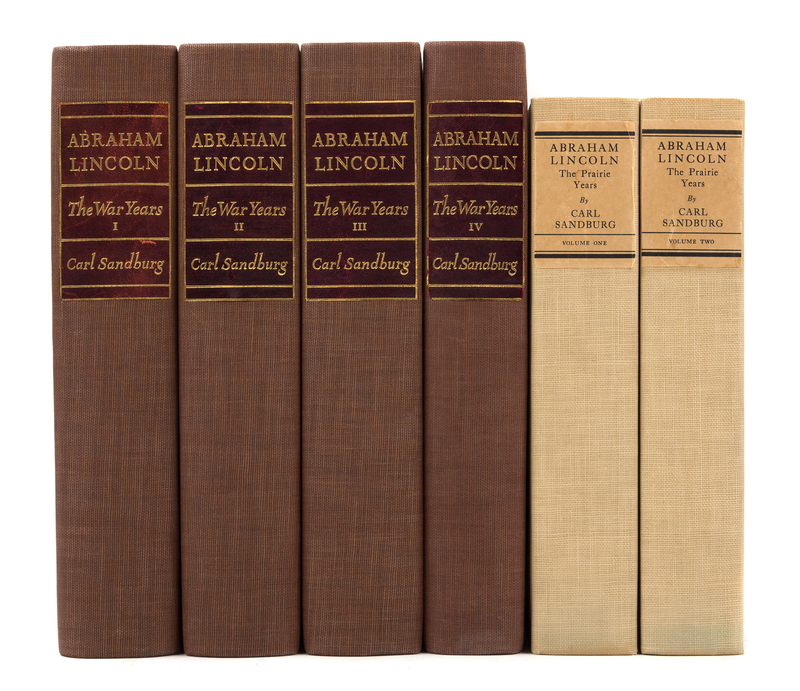 Together 2 works in 6 volumes, 8vo (235/260 x 160/180 mm). Profusely illustrated with plates from photographs, portraits, and facsimiles. Prairie Years: Publisher's tan linen-backed boards, printed paper label on spine, top edge gilt, others uncut (some very minor browning). FIRST EDITION, LIMITED EDITION, number 191 of 260 copies SIGNED BY SANDBURG. PRESENTATION COPY, SIGNED BY SANDBURG: "Reinbold. Chicago 1926. Sandburg." -- War Years: Publisher's red gold-stamped cloth, leather lettering-pieces gilt, top edges gilt, others uncut. FIRST EDITION, LIMITED EDITION, number 120 of 525 copies SIGNED BY SANDBURG.