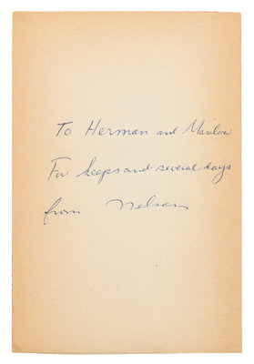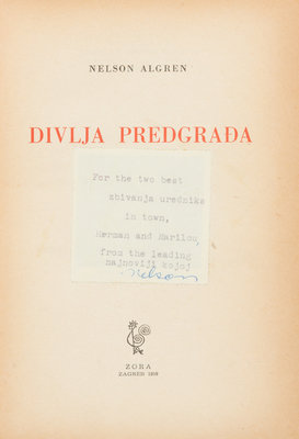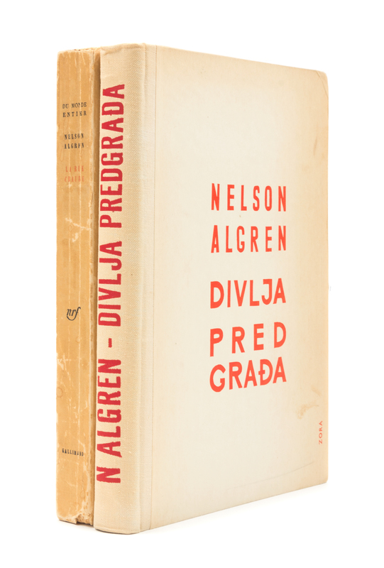 La Rue Chaude. Paris: Gallimard, 1960. 8vo. (Some light browning.) Publisher's wrappers printed in red and black (spine browned, some light chipping). First French edition. PRESENTATION COPY, INSCRIBED BY ALGREN: "To Herman and Marilou For keeps and several days from Nelson." - Divlja Predgrada. Zagreb: Zora, 1959. (Some light browning). Publisher's cloth-backed printed boards; publisher's pictorial dust-jacket. First Yugoslavian edition. PRESENTATION COPY, TYPED SENTIMENT SIGNED BY ALGREN: "For the two best zbivaa urednike in town, Herman and Marilou, from the leading najnoviji kojoj Nelson." - Together, 2 works presented to Herman and Marilou Kogan, long-time friends of Algren, and the dedicatees of the second edition of his Chicago, City on the Make.