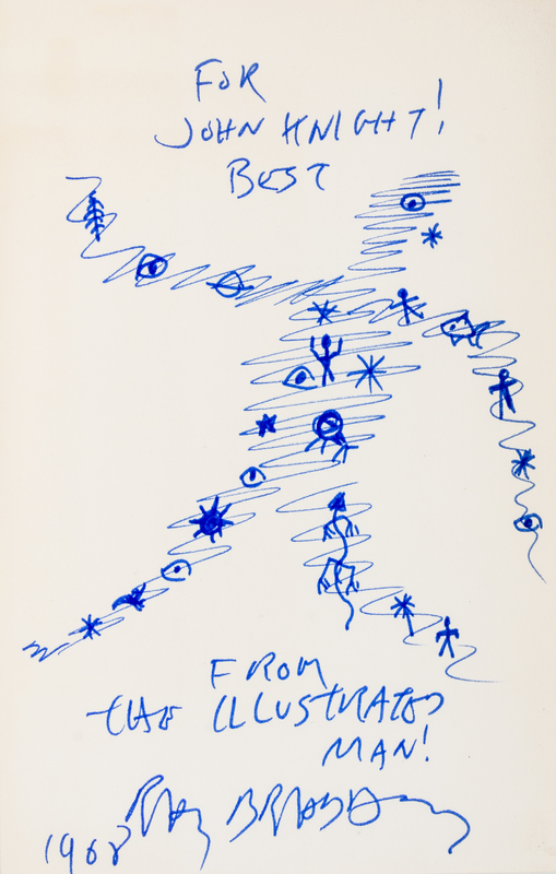 8vo. Publisher's cream cloth, original printed dust jacket (a few tiny chips to spine ends, spine sunned). Later edition published in the same year as the first edition, PRESENTATION COPY, INSCRIBED BY BRADBURY WITH A DRAWING: "For John Knight! Best from Illustrated Man! Ray Bradbury. 1968." Bradbury's drawing mirrors Sydney Butchkes' jacket illustration. See Currey p.56.[With:] BRADBURY, Ray. I Sing the Body Electric! New York: Alfred A. Knopf, 1969. 8vo. Publisher's cloth, original printed dust jacket. FIRST EDITION, PRESENTATION COPY INSCRIBED BY BRADBURY: "For Arthur This copy of "I Sing the Body Electric" with good wishes from Ray Bradbury Oct. 8 1978." Currey p.56.