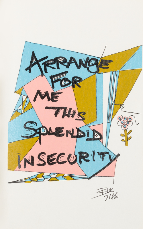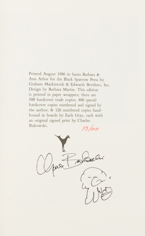 8vo. Original print SIGNED BY BUKOWSKI. Original grey cloth-backed printed boards, acetate jacket. LIMITED EDITION, number 33 of 100 copies with an original print SIGNED BY BUKOWSKI WITH AN ORIGINAL DRAWING on the limitation page.
