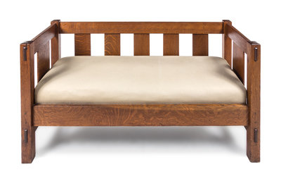 an oak settee, of rectangular form with vertical splats and upholstered seat