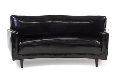 a black vinyl upholstered curved sofa