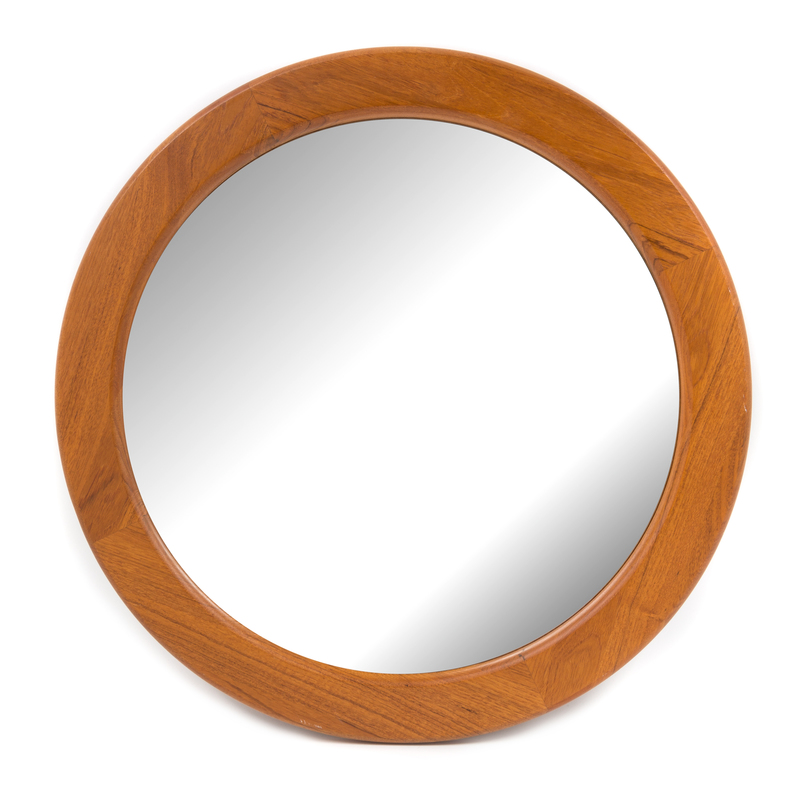 a circular teak mirror
