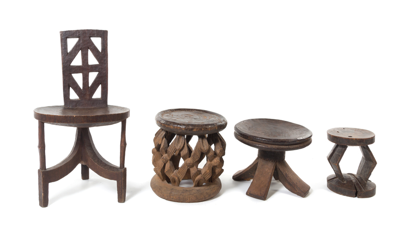 a carved wood chair, and three stools