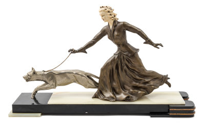 a sculpture, depicting a woman and a guard dog