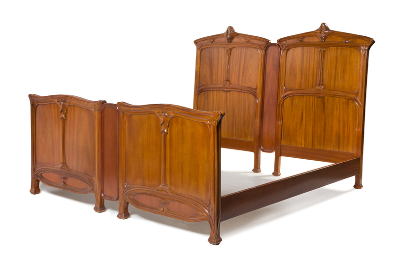 a bedroom set, comprising an armoire separated into two individual display cabinets, two twin headboard's joined to create a single king size bed, a mirror, and a marble top dresser