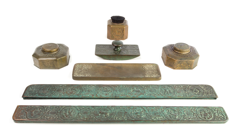 a Zodiac pattern seven-piece desk set, comprising: two inkwells (842), a pen tray (1000), rocker blotter (990), large blotter ends (988) and a pen wipe (1085)