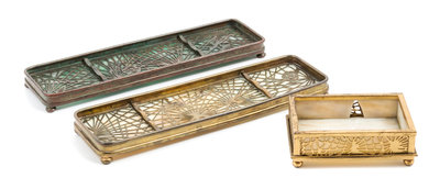 a group of three Pine Needle pattern desk articles, comprising a small box (400) and two pen trays (1004)