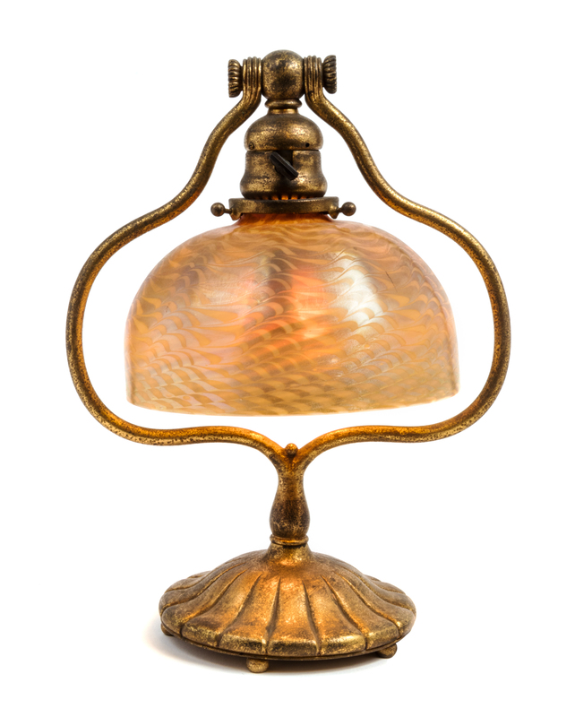 a gilt bronze and Favrile glass desk lamp, having a slightly ribbed Damascene shade raised on a harp base