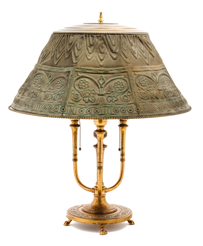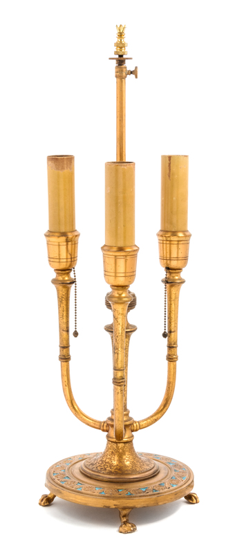 a gilt bronze lamp base, with enameled decoration, with glass bead enhanced metal mesh shade