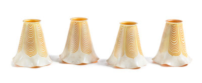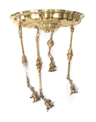 a glass and gilt brass four-light fixture, having four Aurene pendent shades with pulled feather decoration