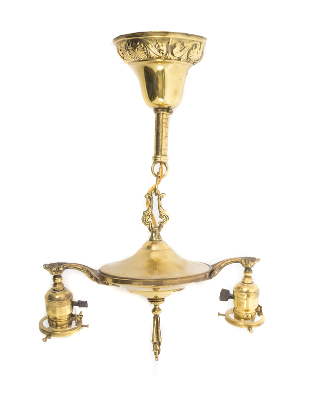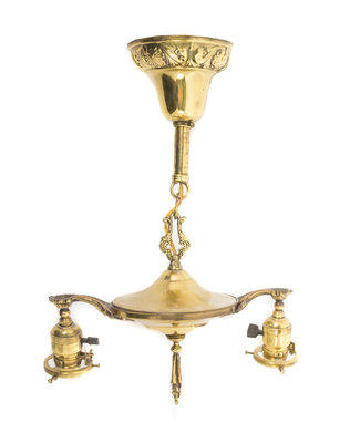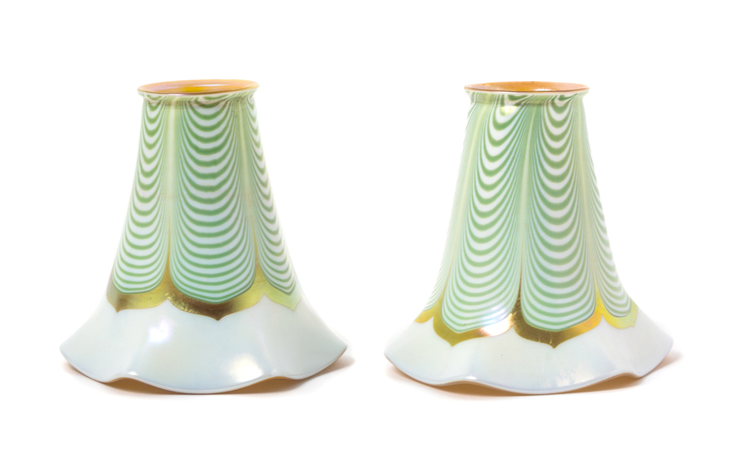 a pair of Aurene glass shades, with pulled feather decoration, together with a brass two-light fixture