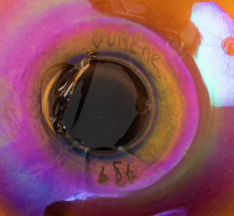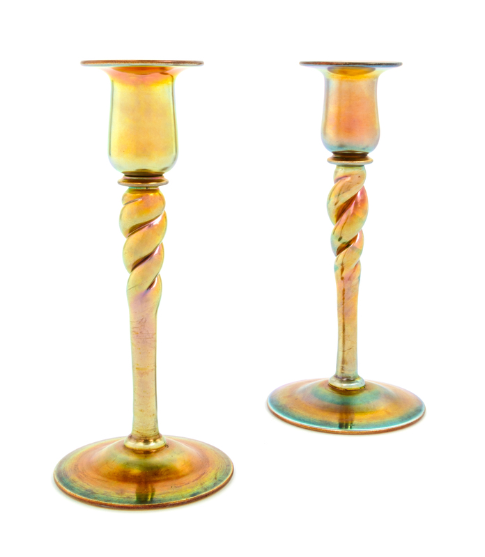 a pair of Aurene glass candlesticks, each of baluster form with twisted stem in gold iridescence