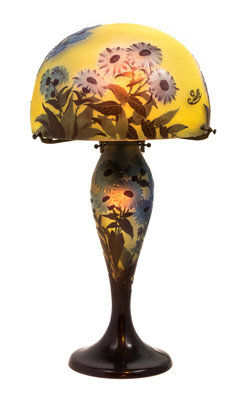 a cameo glass lamp, the domed shade and baluster form base decorated with blue flowers