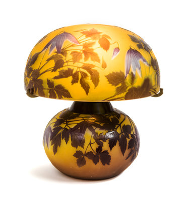 an Alpina Clematis cameo glass lamp, the shade and base with conforming leafy decoration