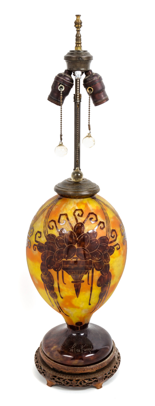 a Le Verre Francais cameo glass vase, of baluster form, mounted as a lamp on a carved wood base