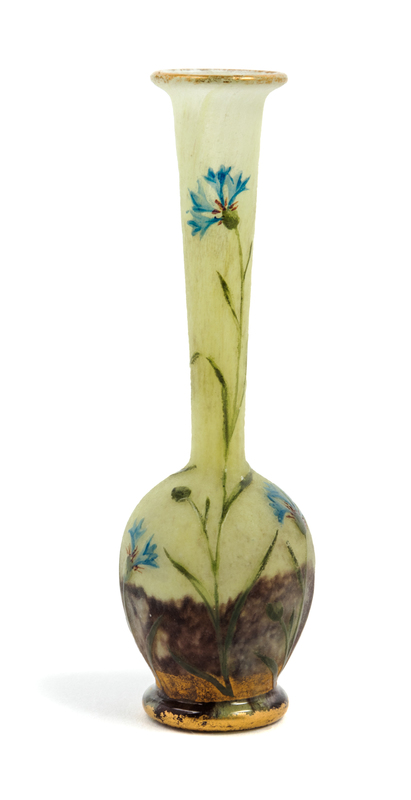 a miniature enameled cameo glass cabinet vase, of bottle form decorated with flowers in a landscape