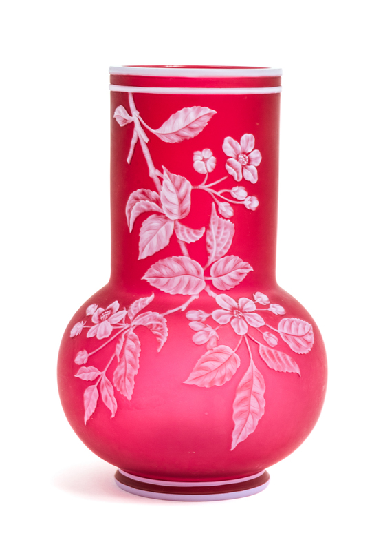 a cameo glass vase, of bottle form, decorated with flowering leafy branches and an insect